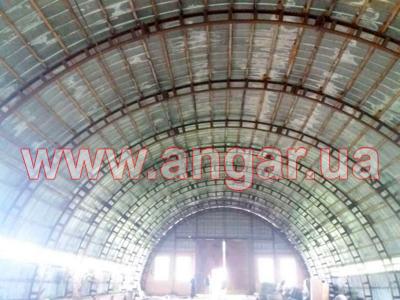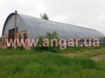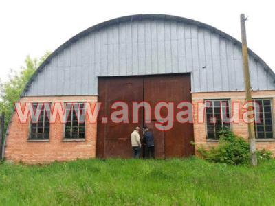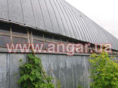 | Ангар арочного типа. Установлен, разукомплектован. Всего 11 металлических арок. Шаг арок 3м. Каждая арка состоит из 5 сегментов. Всего 55 сегментов. Верхний и нижний пояс каждого сегмента из швеллера сечением 100мм, расшитого между собой пластинами из листового металла. Всего 8 торцевых колонн из швеллера сечением 120мм сваренного в коробку. В комплекте двое торцевых раздвижных ворот размером 4,5х4,5м. Ангар обшит оцинкованным листом размером 0,9х2м. Толщина металла 0,7мм. Торцевые стороны до половины заложены кирпичом. |