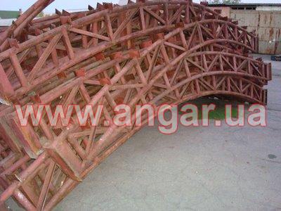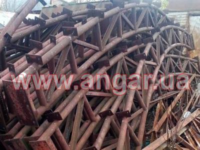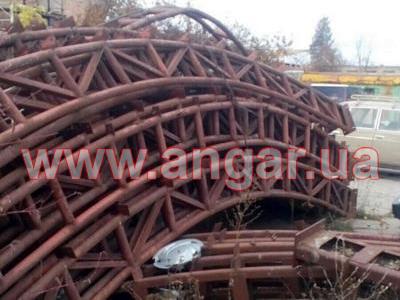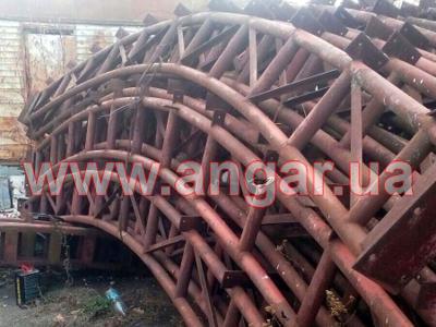 | Ангар арочного типа. Демонтированный каркас. Всего 11 металлических арок. Арки устанавливались с шагом 3м. Каждая арка состоит из 4 сегментов. Всего 44 сегмента. Верхний и нижний пояс каждого сегмента состоит из трубы сечением 60мм, расшитого между собой трубой и уголком. Толщина металла 3,5мм. Торцевые колонны и ворота отсутствуют. Ангар складирован и готов к погрузке. |