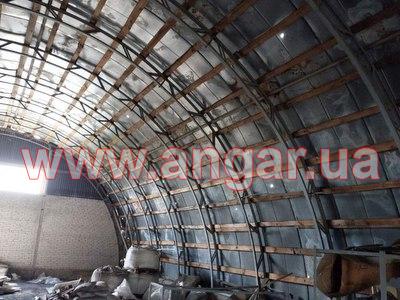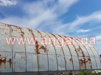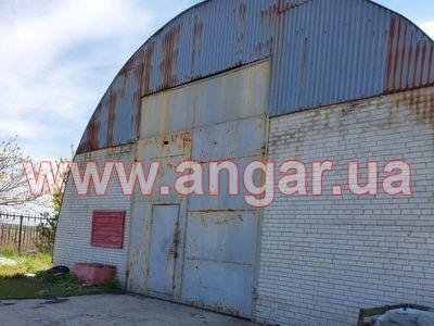 Ангар аркового типу. Встановлений. Металева арка (ферма) складається з 4 сегментів. Кожен сегмент з двох швелерів перерізом 60мм розварених між собою на відстані таким самим швелером. Всього 11 арок. Крок арок 2,1м. Обшитий оцинкованим листом. Одні торцеві ворота розміром 4х5м. Торці закладені цеглою до висоти 4м.