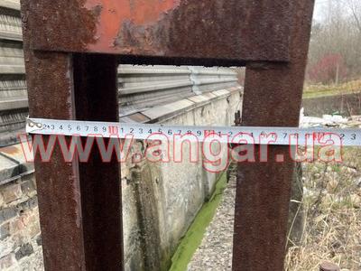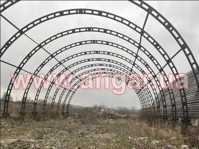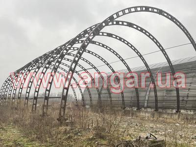 Ангар аркового типу. Встановлений каркас. Металева ферма (арка) складається з 4 сегментів. Кожен сегмент зварений з двох швелерів перерізом 120мм, розварених між собою пластинками листового металу. Крок ферм 3м.