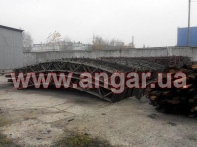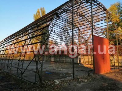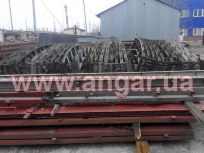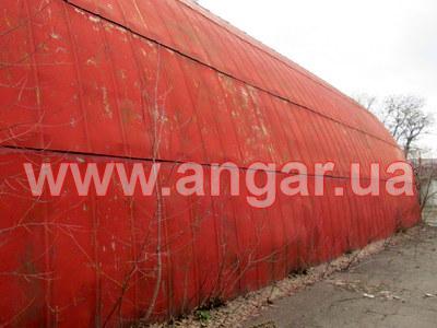 | Ангар арочного типа. Демонтирован, в полной комплектации. Всего 12 металлических арок. Арки установлены с шагом 3м. Каждая арка состоит из 5 сегментов. Всего 60 сегментов. Верхний и нижний пояс каждого сегмента состоит из швеллера сечением 65мм. Всего 8 торцевых колонн. В комплекте торцевые распашные ворота размером 3,60мх3,80м. Ангар обшит оцинкованным листом 1х2м, лист покрашен. Толщина металла 0,75мм. |