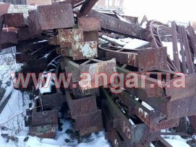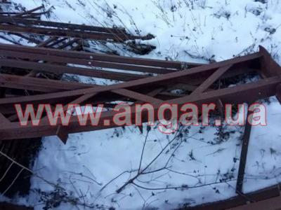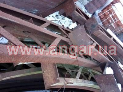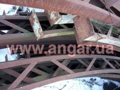 Ангар арочного типа. Демонтированный каркас. Разукомплектован. Всего 19 металлических арок. Шаг арок 4м. Каждая арка состоит из 2-х сегментов. Всего 38 сегментов. Верхний и нижний пояс каждого сегмента состоит из катаного швеллера сечением 120мм, расшитого между собой пластинами из листового металла. Торцевых колонн и ворот в комплекте нет. Ангар складирован и готов к погрузке.