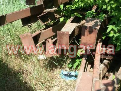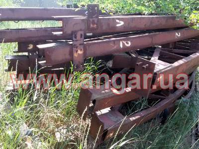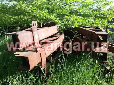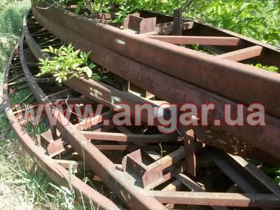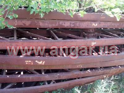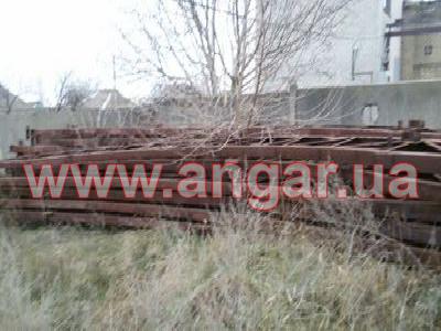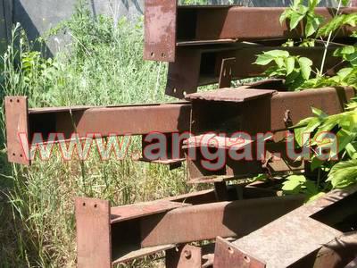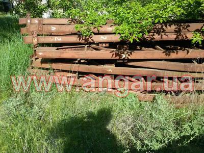 | Ангар арочного типа. Демонтированный каркас. Металлическая ферма состоит из двух сегментов. Верхний и нижний пояс сегмента из гнутого швеллера сечением 120х50мм, раскосы из равнополочного уголка сечением 30х30мм. Всего 14 сегментов (7 арок). Пятки у сегментов обрезаны. Крепление сегментов между собой на болтовом соединение. Шаг ферм 6м. В комплекте 54 поперечных прогона (48 промежуточных и 6 коньковых) состоящих из двух гнутых швеллеров сечением 120х50мм, раскосы из равнополочного уголка сечением 30х30мм. Торцевые колонны из гнутого швеллера сечением 120мм. Всего торцевых колонн - 4шт (не хватает 4 колонны). В комплекте двое торцевых распашных ворот размером 4х4м. |