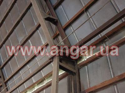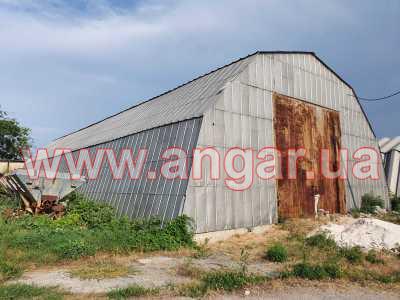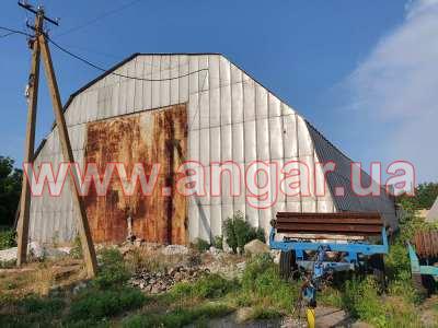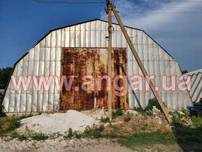 Ангар арочного типа. Установлен в полной комплектации. Всего 11 металлических арок. Шаг арок 3м. Каждая арка состоит из 6 сегментов. Всего 66 сегментов. Верхний и нижний пояс каждого сегмента из швеллера сечением 100мм, расшитого между собой швеллером сечением 100мм. На стыках сегментов связи из 75 уголка. Всего 5 рядов (150м.п.) Ворота распашные размером 5х5м. Обшит алюминиевым листом.