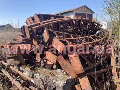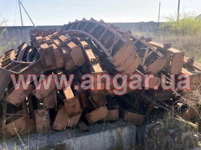 | Ангар арочного типа. Демонтированный каркас. Всего 11 металлических арок. Шаг арок 3м. Каждая арка состоит из 6 сегментов. Всего 66 сегментов. Верхний и нижний пояс каждого сегмента из швеллера сечением 120мм, расшитого между собой швеллером сечением 120мм. Всего 12 торцевых колонн из швеллера сечением 140мм. Ворота раздвижные ширина 5,6м, высота 4,5м. В комплекте две направляющих ворот. Ангар складирован и готов к погрузке. |