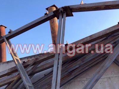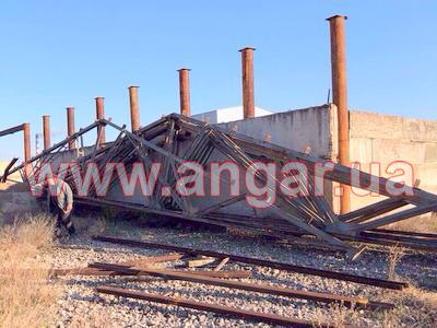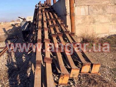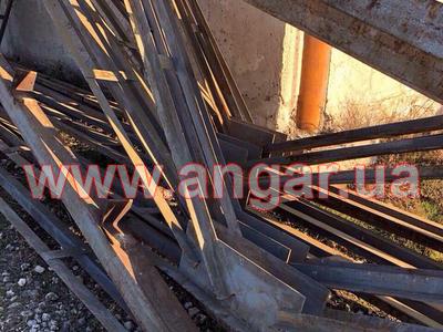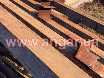 | Ферма. Металлическая двускатная. Ширина 21м. Высота 2,7м. Цельносварная. Верхний пояс из швеллера сечение 120мм сваренного в коробку. Нижний пояс и раскосы из двух уголков сечением 75мм, сваренных на расстоянии пластинами из листового металла. Крепление к колоннам на сварке. Фермы устанавливались с шагом 6м. Вес одной фермы 1,25т. Всего 7шт. |