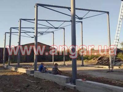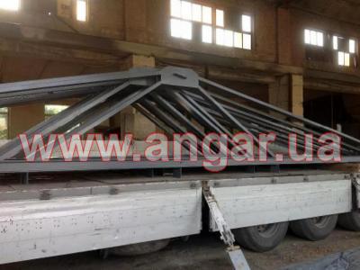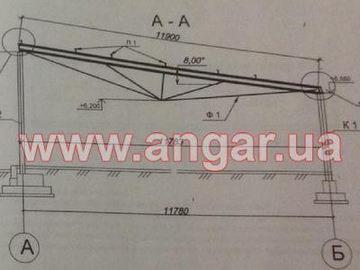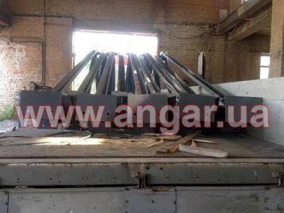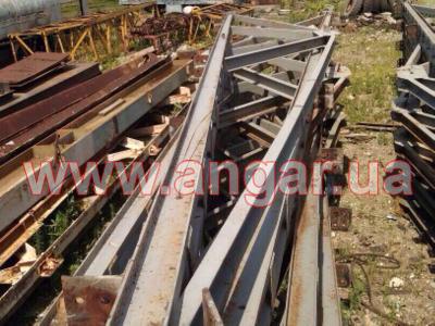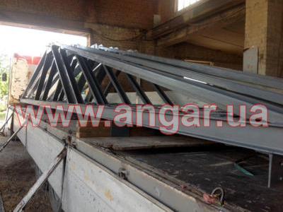 Ферма. Металлическая односкатная. Цельносварная. Ширина 12м. Верхний пояс из спаренного швеллера сечением 120мм. Нижний пояс и раскосы из швеллера сечением 120мм. Фермы устанавливались с шагом 6м. Крепление к колоннам болтовое. Вес около 520кг.