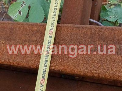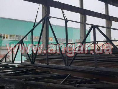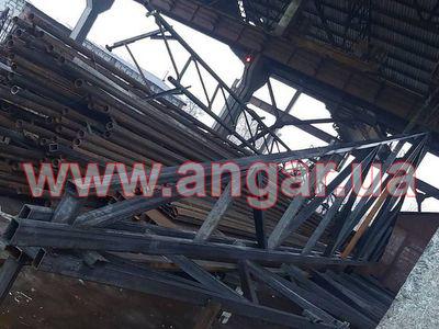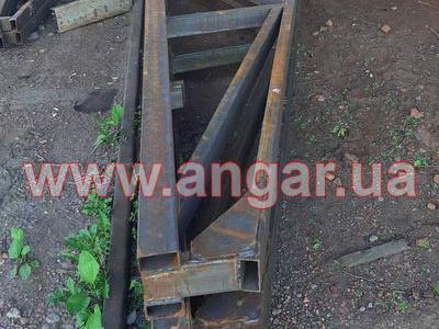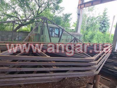 | Ферма металева. Двоскатна. Ширина 18м. Цільнозварна, для перевезення порізана на 3 частини, бокові - 7,25м, і центральна - 3,50м. Верхній пояс профільна труба 100х50мм, нижній пояс подвійна профільна труба 100х50мм. Розкоси 90х50мм. Всього 10 ферм. Крок 6м. Ферми складовані і готові до відвантаження. |