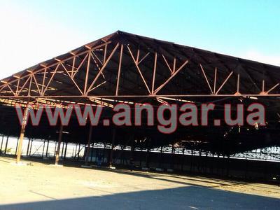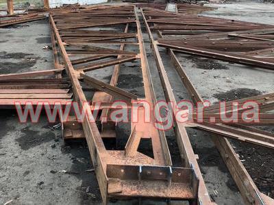 | Ферма. Комплект металлических ферм. Двускатные, цельносварные. Ширина 30м. Высота 4,75м. Верхний и нижний пояс состоит из спаренного уголка сечением 90мм. Фермы устанавливались с шагом 6м. Вес одной фермы около 3т. |