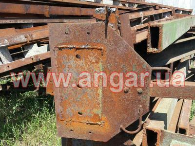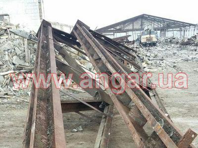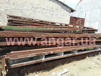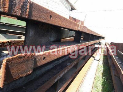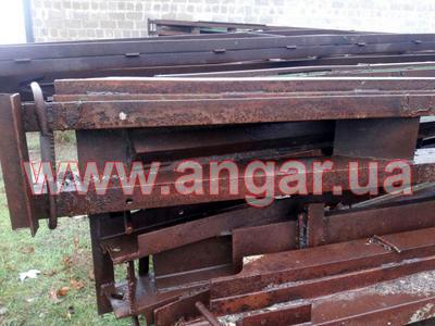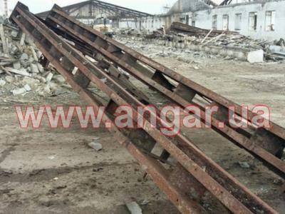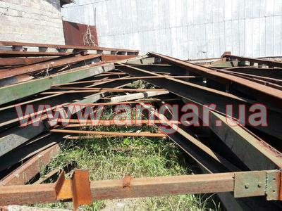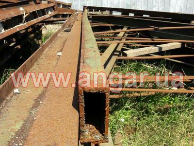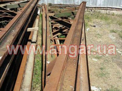 | Ферма. Металлическая двускатная. Ширина 21м. Состоит из двух полуферм. соединение полуферм между собой на сварке. Нижний пояс из швеллера сечением 160мм, Верхний пояс из двух швеллеров сечением 180мм, сваренных на растоянии пластинами. Вес одной фермы около 2,7т. |