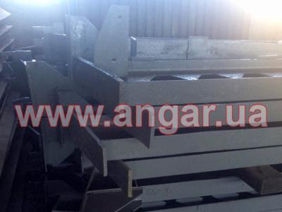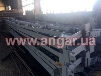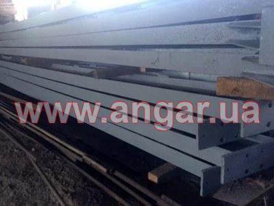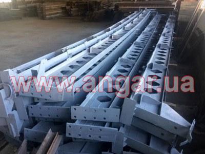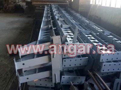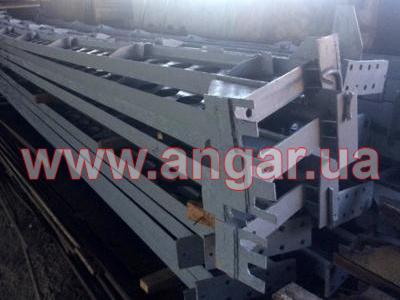 | Ферма. Металлические стропильные фермы из облегченной двутавровой балки сечением 300мм. Длина фермы 20,7м. Длина одного элемента 10,80м (30шт). Высота по центру 3,40м. Шаг балки 3м. Крепление к колоннам сварное. На фермы устанавливались бетонные плиты толщиной 60мм. Всего 15 шт. |
