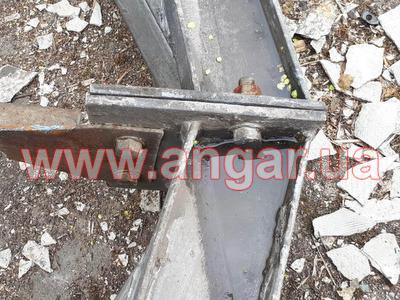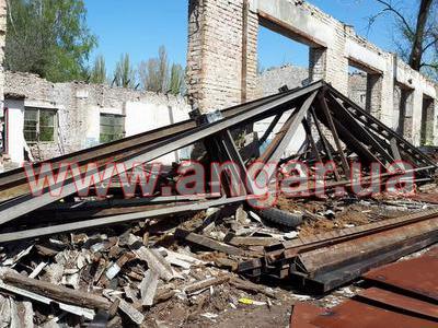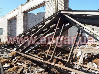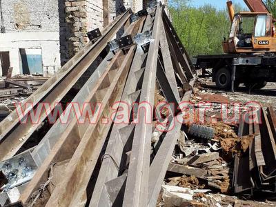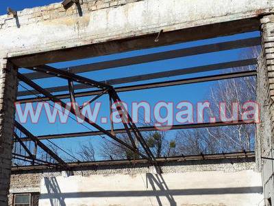 | Ферма. Металлическая двускатная. Ширина 17,5м. Высота 2,3м. Разборная. Верхний пояс сложного сечения, из двух швеллеров №14, сваренных на расстоянии швеллером №14. Нижний пояс из швеллера сечением 140мм, раскосы из швеллера сечением 140мм, и уголка сечением 90мм. Крепление к колоннам болтовое. Фермы устанавливались с шагом 6м. Всего 5шт. Также в комплекте кровельные прогоны из швеллера сечением 220мм, всего 144мп. |