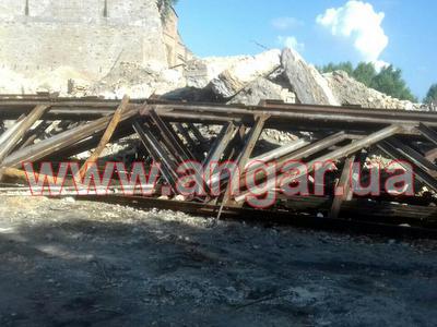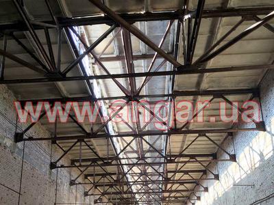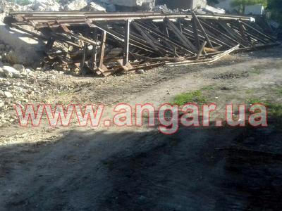| Ферма. Металлическая. Цельносварная. Ширина 13,6м. Высота по центру 2,5м, высота по бокам 2м. Верхний, нижний пояс и раскосы из спаренного уголка. По верхнему поясу ферм приварен швеллер. Фермы устанавливались с шагом 6м. Вес одной фермы около 1,7т. Всего 12 шт. |