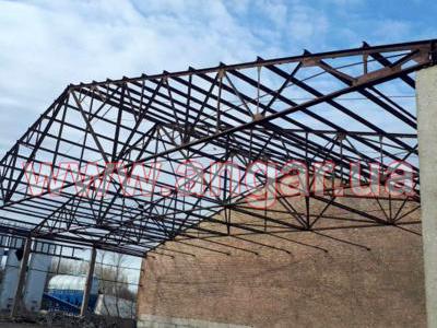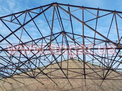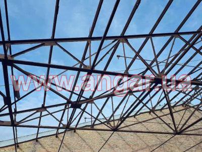 | Кровельный модуль. Ширина 36м. Высота 5,86м. Длина 72м. Кровельный модуль состоит из ферм, металлических прогонов и связей. Все на сварном соединении. Фермы: верхний и нижний пояс из спаренного уголка сечением 75мм. Раскосы из спаренного уголка сечением 63мм, 75мм. Шаг ферм 6м. Прогоны и связи из швеллера сечением 100мм, 140мм, 200мм. Вес кровельного модуля 102т. |