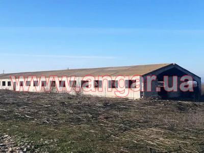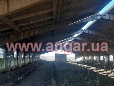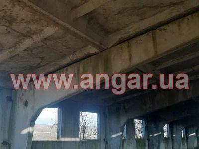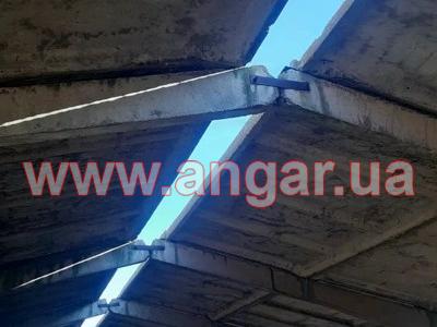 Ангар клюшечный. Установлен, разукомплектован. Шаг клюшек 6м. Всего 11 пар клюшек. На кровле П - образные бетонные плиты размером 3х6м, по фасаду оконные бетонные плиты. Торцы отсутствуют.