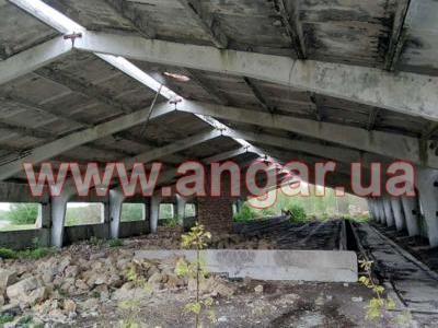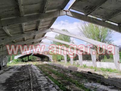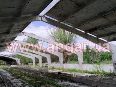 | Ангар клюшечный. Установлен, разукомплектован. Шаг клюшек 6м. Всего 20 пар клюшек. На кровле плиты размером 1,5х6м, по фасаду оконные бетонные плиты размером 3х6м. Подстаканники в комплекте. Отсутствуют 30 шт. кровельных и 5 шт. фасадных плит. |