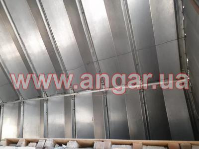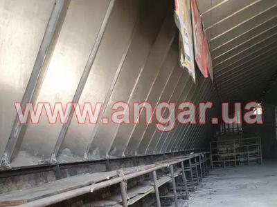 | Ангар шатрового типа. Бескаркасный. Дюралюминиевый. Установлен. Состоит из V - образных элементов выполняющих одновременно функции несущих и ограждающих конструкций. Соединение элементов конструкции между собой и к фундаменту осуществляется на болтах посредством фланцев и закладных деталей. Всего V - образных элементов - 156шт, прямых фасадных элементов - 8шт, торцевых прямых элементов - 28шт, фронтонов - 2шт. В комплекте двое дюралевых торцевых распашных ворот размером 3х3м. |