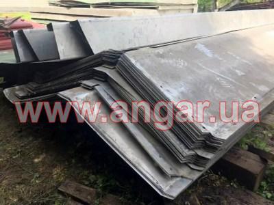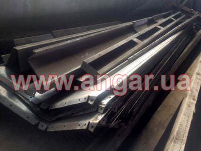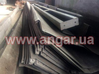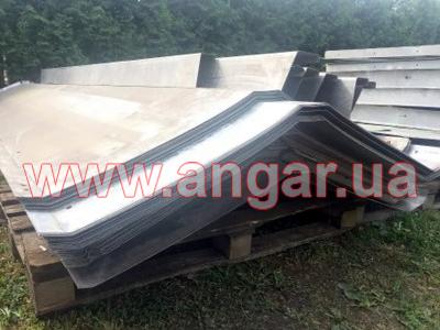 | Ангар шатрового типа. Бескаркасный. Дюралюминиевый. Лежалый. Разукомплектован. Состоит из V - образных элементов выполняющих одновременно функции несущих и ограждающих конструкций. Соединение элементов конструкции между собой и к фундаменту осуществляется на болтах посредством фланцев и закладных деталей. Всего V - образных элементов - 100шт, торцевых прямых элементов - 20шт. Болты, гайки, шайбы: М10 (1912шт). Ворота в комплекте отсутствуют. |