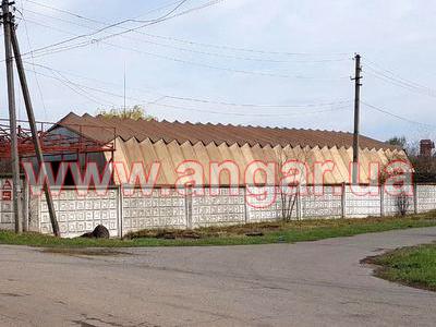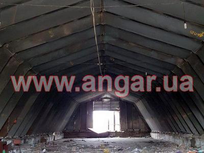 | Ангар шатрового типа. Бескаркасный. Дюралюминиевый. Установлен. Состоит из V - образных элементов выполняющих одновременно функции несущих и ограждающих конструкций. Соединение элементов конструкции между собой и к фундаменту осуществляется на болтах посредством фланцев и закладных деталей. Всего V - образных элементов - 112шт, прямых фасадных элементов - 8шт, торцевых прямых элементов - 16шт. В комплекте двое дюралевых торцевых распашных ворот размером 3х3м. |