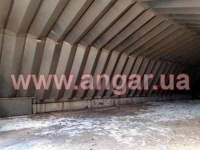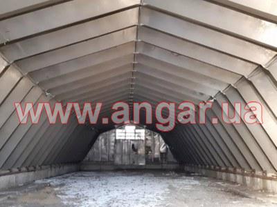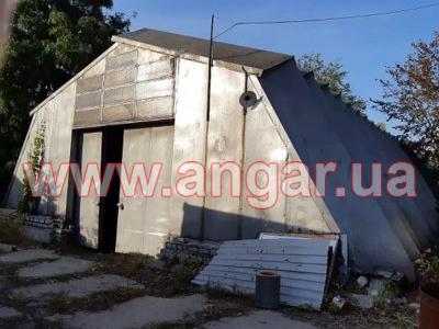 | Ангар шатрового типа. Бескаркасный. Дюралюминиевый. Установлен. Состоит из V - образных элементов выполняющих одновременно функции несущих и ограждающих конструкций. Соединение элементов конструкции между собой и к фундаменту осуществляется на болтах посредством фланцев и закладных деталей. Всего V - образных элементов - 108шт, прямых фасадных элементов - 8шт, торцевых прямых элементов - 16шт, фронтонов - 2шт. В комплекте двое дюралевых торцевых раздвижных ворот размером 3,6х3м. |