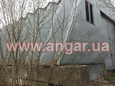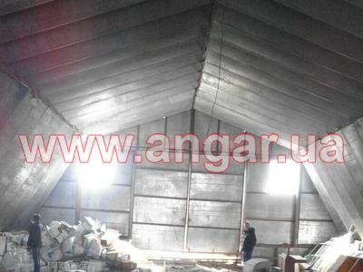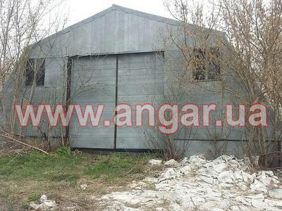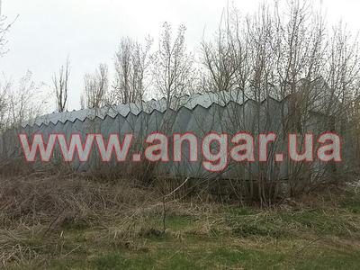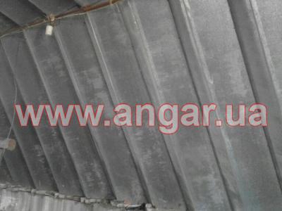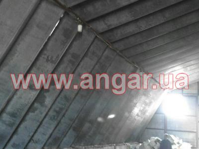 Ангар шатрового типа. Бескаркасный. Оцинкованный. Установлен. Состоит из V - образных элементов выполняющих одновременно функции несущих и ограждающих конструкций. Соединение элементов конструкции между собой и к фундаменту осуществляется на болтах посредством фланцев и закладных деталей. Всего V - образных элементов - 100шт. В комплекте двое торцевых раздвижных ворот размером 4мх4м.