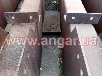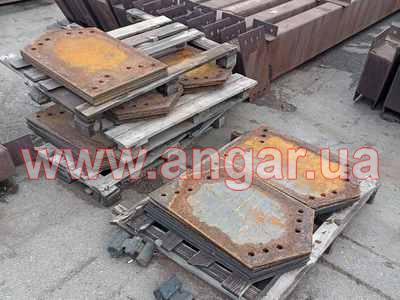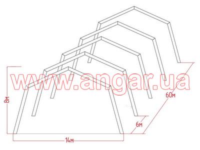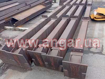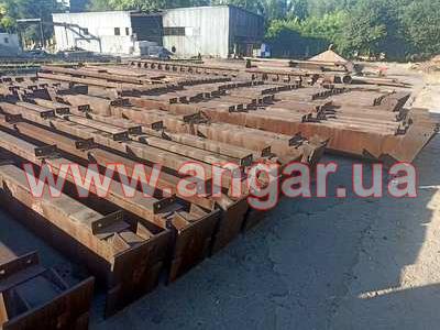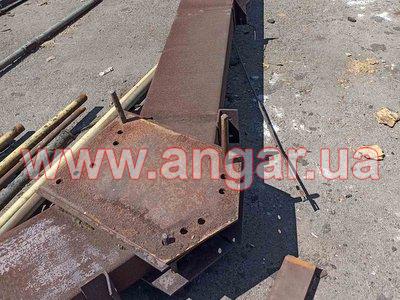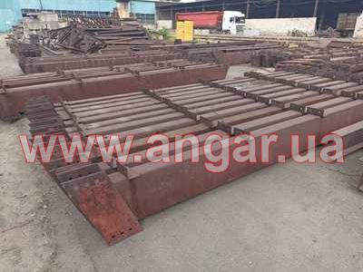 Ангар шатрового типу. Демонтований каркас. Рама складається з 4 сегментів. Кожен з сегментів коробчастого перетину розміром 390х160х5мм. Довжина верхніх сегментів 5655мм, довжина нижніх сегментів 6055мм. Опорна пластина розміром 525х400х20мм. Сегменти збираються в цільну раму на болтах через пластини товщиною 10мм. Крок рам 6м. Всього 11 рам (44 сегменти). Сегменти складовані і готові до відвантаження.