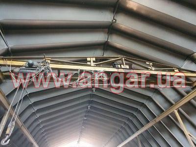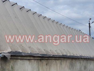 | Ангар шатрового типу. Безкаркасний дюралюмінієвий. Встановлений. Складається з V-образних елементів, що виконують роль огороджувальних та несучих конструкцій. Зєднання елементів між собою здійснюється за допомогою болтів. Всього V-образних елементів - 112шт. Прямих фасадних елементів - 8шт. Торцеві елементи та фронтони - 2 комплекти. Ворота розміром 3,5х4,6м. |