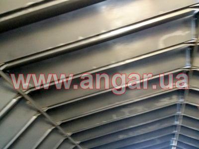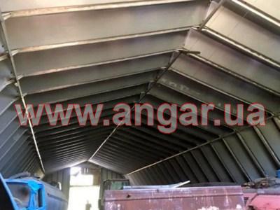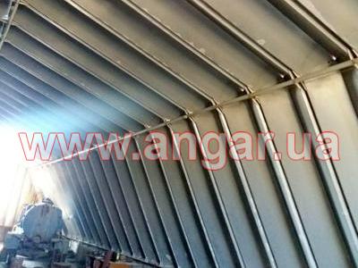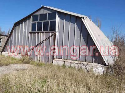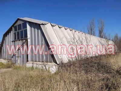 | Ангар шатрового типа. Бескаркасный. Дюралюминиевый. Состоит из V - образных элементов выполняющих одновременно функции несущих и ограждающих конструкций. Соединение элементов конструкции между собой и к фундаменту осуществляется на болтах посредством фланцев и закладных деталей. Всего V - образных элементов - 116шт., прямых фасадных элементов - 8шт., торцевых прямых элементов - 28шт., фронтонов - 2шт. В комплекте двое распашных ворот размером 3х3,10м. |