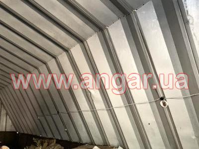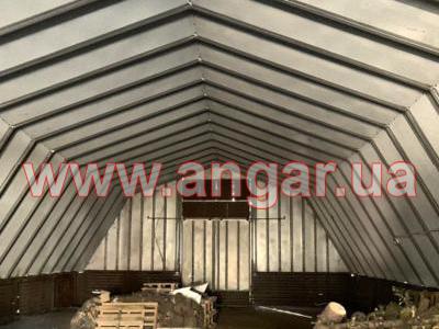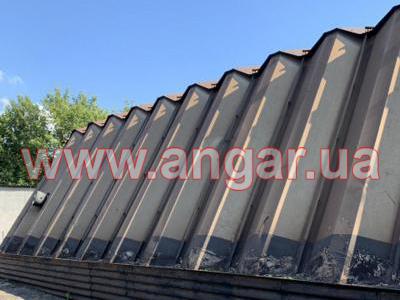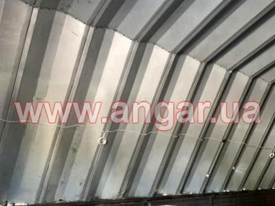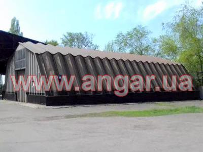 | Ангар шатрового типа. Бескаркасный. Дюралюминиевый. Состоит из V - образных элементов выполняющих одновременно функции несущих и ограждающих конструкций. Соединение элементов конструкции между собой и к фундаменту осуществляется на болтах посредством фланцев и закладных деталей. Всего V - образных элементов - 80шт, прямых фасадных элементов - 8шт, торцевых прямых элементов - 28шт, фронтонов - 2шт. В комплекте двое дюралевых торцевых раздвижных ворот размером 3,05мх3,10м. |