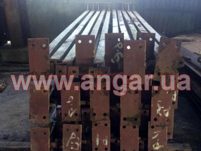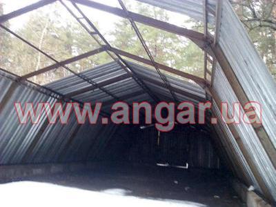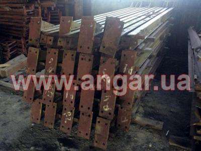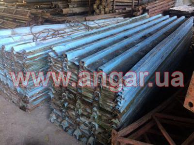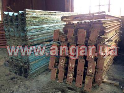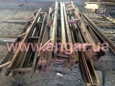 | Ангар шатрового типа. Каркасный, демонтирован, разукомплектован. Всего 10 металлических рам. Рамы устанавливались с шагом 3,30м. Рама состоит из 4 сегментов. Каждый сегмент из двутавровой балки сечением 160мм. Всего 40 сегментов. Сегменты соединяются между собой на болтах, крепление к фундаменту на анкерах. В комплекте 5 рядов металлических прогонов из двух швеллеров сечением 60мм сваренного на расстоянии уголком. Торцевые распашные ворота размером 3мх3м. Ангар обшивался оцинкованным листом размером 0,85мх4м, высота волны 50мм, всего 140 листов. Торцов нет. Ангар складирован и готов к погрузке. |