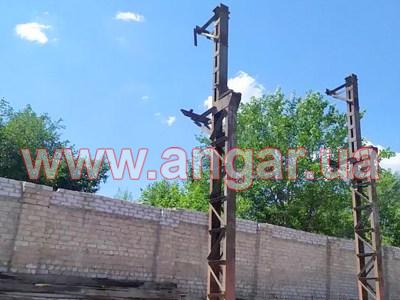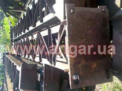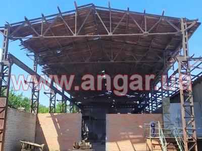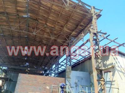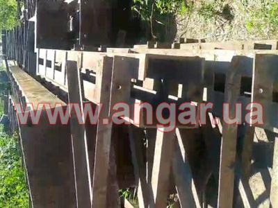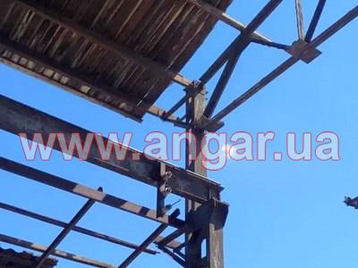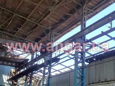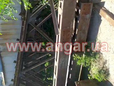 | Ангар прямостенного типа. Демонтированный каркас. Колонна сложного сечения из двух швеллеров сечением 240мм, сваренных на расстоянии уголком сечением 50мм. Высота колонны 9,10м. Высота до установки кран - балки 6,6м. Надколонник длиной 2500мм, из спаренного швеллера сечением 240мм. Шаг колонн 6м. Всего 22 колонны. Крепление к фундаментам на анкерных болтах. Ферма двускатная. Верхний и нижний пояс и раскосы из спаренного уголка сечением 75мм. Всего 11 ферм. Ферма приходит в бок надколонника на высоте 8,05м. Крепление ферм к надколоннику болтовое. Подкрановый путь из двутавровой балки сечением 300мм. Вес конструкции около 33.60т. |