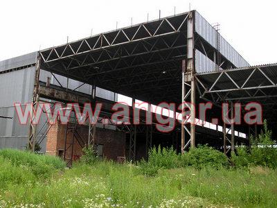 | Ангар прямостенного типа. Типовой проект Молодечно. Три пролета по 24м. Высота пролетов 9м, 16м. Колонны - усиленная двутавровая балка М36 (толщина стали 9,5мм). Колонны (16-ти метрового пролета) состоят из спаренных на расстоянии усиленной балки М30 и двутавровой 30 балки. В центральном пролете, на высоте 9м предусмотрена установка мостового крана, грузоподъемностью 3,2т. |