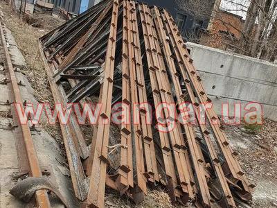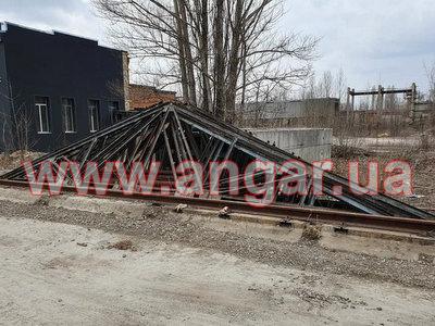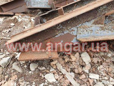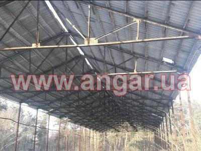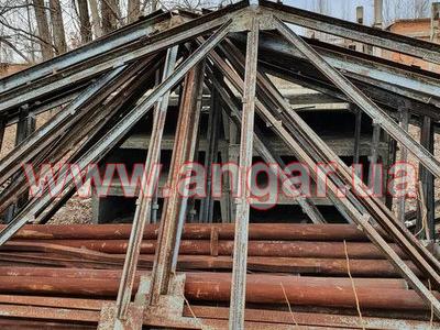 Ангар прямостенного типа. Навес. Демонтированный каркас.. Колонны из трубы сечением 100мм. Толщина стенки 6мм. Шаг колонн 4м. Всего 16 колонн. Пяток нет (колонны были забетонированы). Верхний и нижний пояс ферм из спаренного уголка сечением 75мм раскосы из спаренного уголка сечением 45мм. Всего 8 ферм. Крепление к колонам сварное. Навес складирован и готов к погрузке.