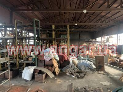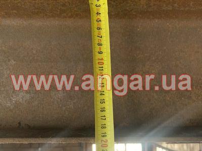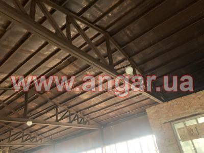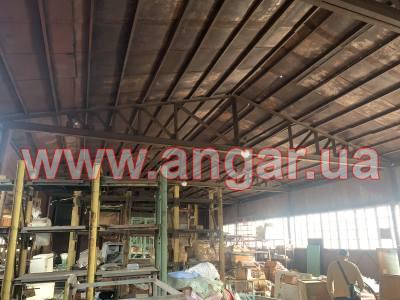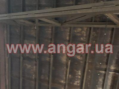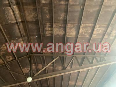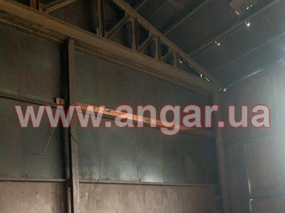 | Ангар прямостінного типу. Встановлений в повній комплектації. Колони з труби перерізом 194мм, стінка 5мм, Крок колон 6м. Торцеві колони зі спареного в коробку швелеру перерізом 120мм. Ферма висотою 2м, верхній пояс та розкоси спарений 70 кутник, нижній пояс спарений 20 швелер. Прогони зі швелеру перерізом 80мм. Всього 20 рядів. Обшитий листовим металом товщиною 1,5мм. Ворота 4,5х4,3м |
