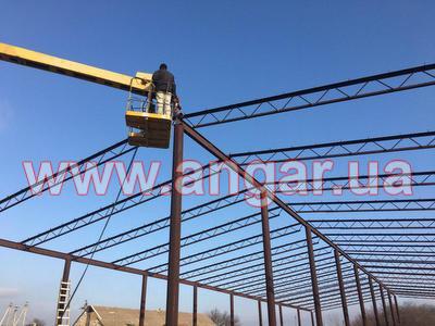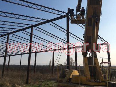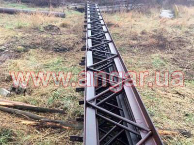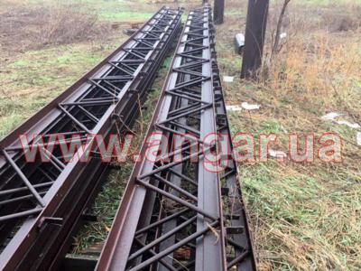 трубы сечением 325мм, стенка 8мм. Высота центрального ряда колонн 7,5м (1м в земле), высота боковых рядов колонн - 6м (1м в земле). Шаг колонн 6м. Всего 9 центральных колонн и 18 боковых колон. Нижний и верхний пояс фермы из уголка сечением 80мм, стенка 8мм. Раскосы из прута сечением 24мм. Шаг ферм 3м. Всего 34 фермы. Подстропильная балка (прогоны по верху колонн) из двутавра сечением 270мм. (144 м.п.) Все соединения сварные. |