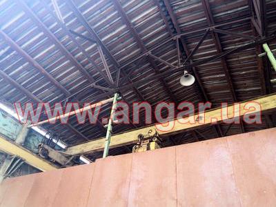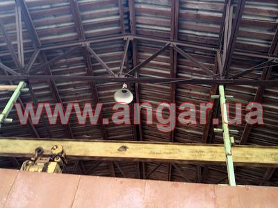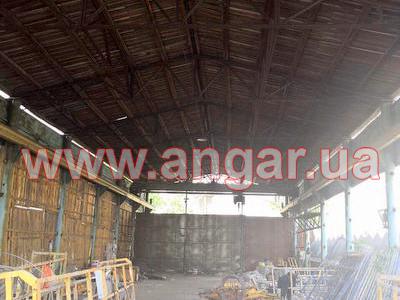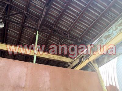 | Ангар прямостенного типа. Установленный каркас. Колонны из трубы сечением 273мм, толщина стенки 8мм. Всего 18 колонн. Шаг колонн 4,50м. Высота колонны 6м. Крепление к фундаментам на анкерах. Фермы цельносварные. Верхний, нижний пояс и раскосы из спаренного уголка сечением 63мм. Крепление к колоннам болтовое. Высота фермы 2м. Всего 9 ферм. Кран балка грузоподъёмностью 3,2т., установлена на высоте 4,5м. Подкрановый путь из двутавровой балки сечением 360мм. |