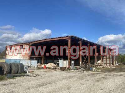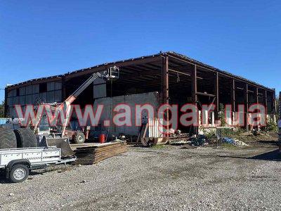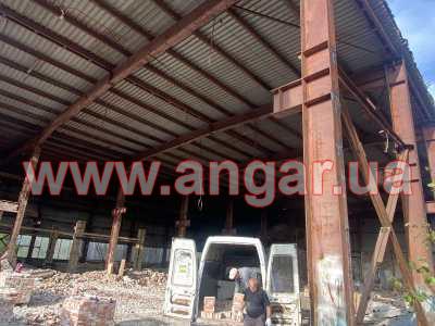 Ангар прямостінного типу. Встановлений каркас. Під складське або виробниче приміщення. Два прольоти по 18м. Висота 9м. Колони виготовлені з двотавра перерізом 500х300х12мм. Опорна пластина товщиною 30мм. Крок колон 6м. Кріплення до фундаменту на анкерах. Всього 24 колони. Покрівельні балки з двотарву перерізом 500х250х10мм. Кріплення між собою таф до колон на болтах. Всього 32 балки. Покрівельні прогони зі швелеру перерізом 240мм товщина стінки 7мм. Всього 1344 м.п. На покрівлі несучий профлист товщиною 1,5мм (зверху пиріг з ППУ та руберойду)