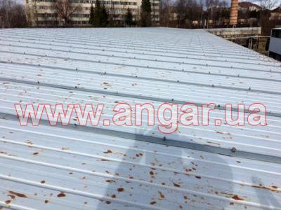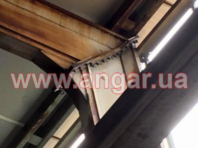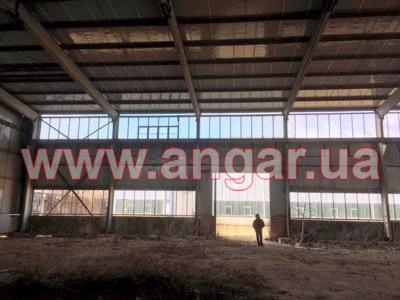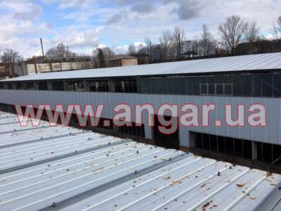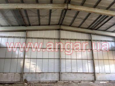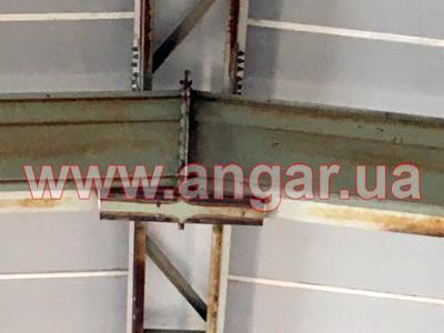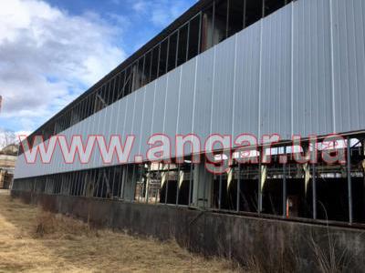 | Ангар прямостенного типа. Установлен, разукомплектован. Колонны представляют систему каркаса из рам коробчатого сечения, сваренного листового металла в виде двутавровой балки сечением 720х155мм, которые устанавливаются с шагом 6м. Высота колонны 9м. Крепления рам к фундаменту - болтовое. Торцевые колонны из двутавровой балки сечением 200мм. Всего 6шт. В ангаре на высоте 6,60м установлены две кран-балки грузоподъёмностью 3т и 5т. Подкрановый путь из двутавра сечением 300мм. Кровельные прогоны из швеллера сечением 140мм, всего 1152м.п. ( 16 рядов, 2 из которых из спаренного швеллера 140мм, расшитого пластинами из листового металла). Стеновые прогоны из швеллера сечением 140мм, всего 480м.п. (4 ряда по торцам, 3 ряда по одному фасаду и 1 ряд по второму фасаду). Обшит ангар сэндвич-панелью: кровля - размер 1х12м, фасад - размер 1х7м, торцы - размер 1х4м. Ворота, 2шт: торцевые - раздвижные, размером 3,70х4,20м; фасадные - распашные, размером 3,70х4,20м. |