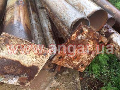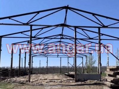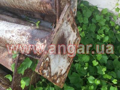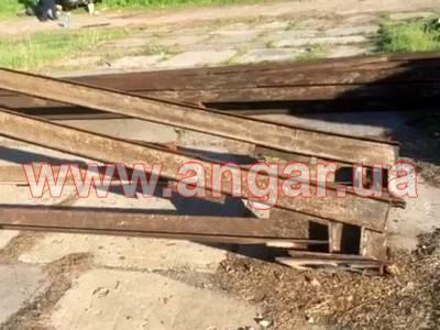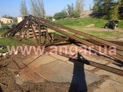 | Ангар прямостенного типа. Демонтированный каркас. Колонны из трубы сечением 325мм, толщина стенки 10мм. Всего 20 колонн (14 несущих + 6 торцевых). Шаг колонн 6м. Высота колонны 6,90м. Крепление к фундаментам на анкерах. Фермы цельносварные. Верхний пояс из спаренного швеллера сечением 160мм, нижний пояс из спаренного уголка сечением 110мм, раскосы из спаренного уголка сечением 80мм. Крепление к колоннам сварное. Высота фермы 2,90. Всего 7 ферм. Вес конструкции 22т. |