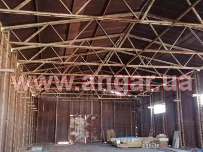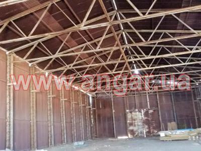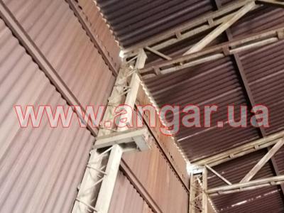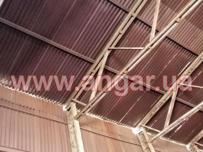 | Ангар прямостенного типа. Установлен в полной комплектации. Несущие колонны сложного сечения из двух швеллеров №14 сваренных на расстоянии арматурой полками во внутрь. Высота колонны 6,70м. Всего 26 колонн. Шаг колонн 4м. Крепление к фундаменту на анкерах. Фермы разборные. Верхний пояс - двутаврового сечения, состоящий из двух швеллеров №14, сваренных между собой на расстоянии пластинами, сечение в виде ][. Нижний пояс и раскосы из гнутого двутаврового сечения, состоящие из двух швеллеров №10, сваренных между собой на расстоянии пластинами, сечение в виде ][. Высота фермы 2,60. Всего 13 ферм. Кровельные прогоны - 10 рядов, стеновые прогоны - 4 ряда. Стеновые прогоны из уголка сечением 75мм. Предусмотрена установка кран-балки на высоте 4,40м. Обшит ангар железным листом, размер листа 6 метров, толщина листа 1,2мм. В комплекте торцевые раздвижные ворота размером 4,5мх4м, и фасадные распашные ворота размером 3,5х4м. Вес около 70т. |