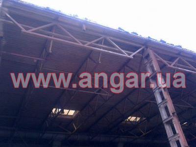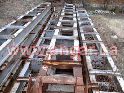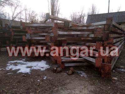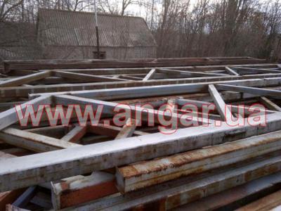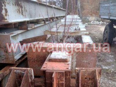 Ангар прямостенного типа. Модульное здание. Типовой проект Молодечно. Демонтированный каркас. Несущие колонны сложного сечения из двух двутавров сечением 400мм сваренных на расстоянии швеллером сечением200мм. Высота колонны 13,20. Шаг колонн 12м. Всего 8 колонн. Стропильные фермы из двух полуферм длиной 12м. Высота фермы 2м. Всего 10 ферм (20полуферм). Шаг ферм 4м. Подстропильные фермы длиной 12м - 6шт. Конструкция на болтовом соединении. Вес конструкции около 49т.