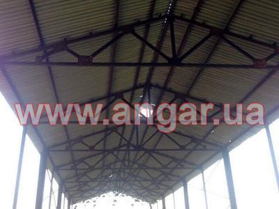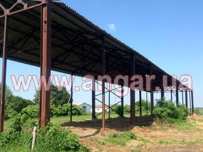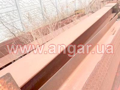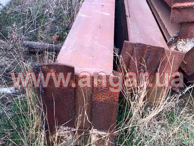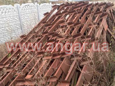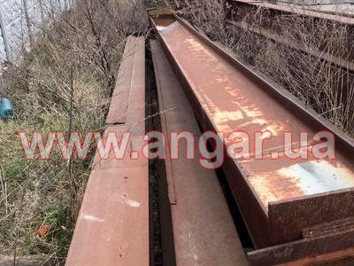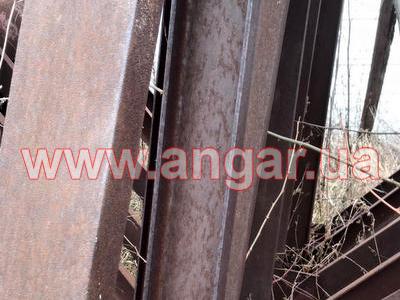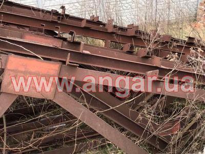 | Ангар прямостенного типа. Демонтированный навес. Двускатный. Разукомплектован. Несущие колонны двух типов. Первые из двутавровой балки сечением 450мм. Всего 12шт. Шаг колонн 12м. Высота колонны 7м. Вторые из спаренного швеллера сечением 120мм (отсутствуют в комплекте). Фермы цельносварные. Верхний, нижний пояс и раскосы из швеллера сечением 120мм. Высота фермы 2,25м. Всего 11 шт. Крепление ферм к колоннам сварное. Прогоны и связи отсутствуют. |