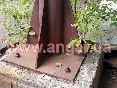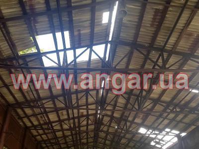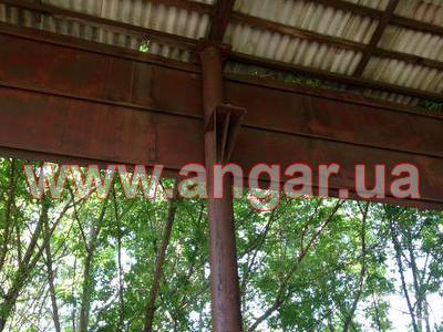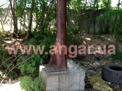 | Ангар прямостенного типа. Установленный каркас. Колонны из трубы сечением 273мм, толщина стенки 8мм. Всего 18 несущих колонн. Шаг колонн 4,5м. Высота колонны 7м. Предусмотрена установка кран балки Q = 3.2т. на высоте 6м. Крепление к фундаментам на анкерах. Фермы цельносварные. Верхний и нижний пояс из спаренного уголка сечением 70мм, раскосы из спаренного уголка сечением 63мм. Крепление к колоннам болтовое. Высота фермы 2м. Всего 9 ферм. |