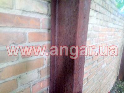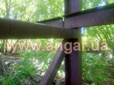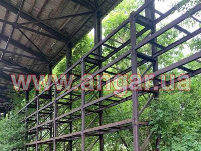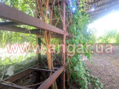 | Ангар прямостенного типа. Установленный каркас. Несущие колонны из спаренного, на расстоянии 1м, швеллера сечением 160мм. Шаг колонн: 3м и 6м. Всего 28 шт. (17 шт. по одной стороне ангара, 11 шт. по другой стороне ангара). Торцевые колонны - 6шт., из двутавровой балки сечением 160мм. Высота колонны 8м. Крепление к фундаментам на анкерных болтах. Между несущими колоннами, через каждый метр, расположены стелажи. Крепление к колоннам болтовое. Фермы разборные. Верхний пояс из двутавровой балки сечением 200мм, нижний пояс из спаренного уголка сечением 75мм. Шаг ферм 3м. Всего 17шт. Крепление ферм к колоннам болтовое. В каждом пролёте фермы связаны между собой связями. По фасаду по верху идут связи для усиления. |