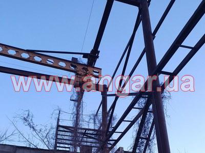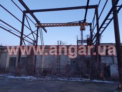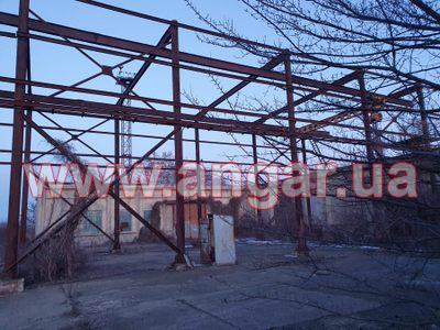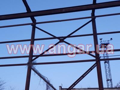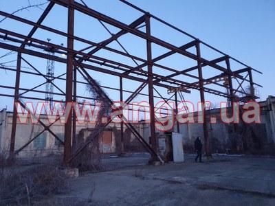 Ангар прямостінного типу. Демонтований каркас. Під складське (склад) або виробниче (цех) приміщення. Колони з труби перерізом 300мм. Кріплення до фундаментів на анкерних болтах. Опорна пластина розміром 500х500х20мм. Крок колон 6м. (В одному прольоті крок колон 8м) Всього Кроквяна балка з двотавру перерізом 300мм. Кріплення до колон зварне. На висоті 10м встановлена підвісна кран балка вантажністю 2,0т. Підкрановий шлях двотаврова балка перерізом 360мм. Хрестові вязі кутник перерізом 100мм. Стінові прогони швелер перерізом 100мм.