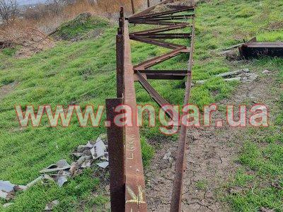 Ангар прямостенного типа. Демонтированный каркас. Колонны из спаренного швеллера сечением 180мм. 3 колонны из 36 двутавра. Шаг колонн 6м. Всего 20 колонн. Крепление к фундаментам на закладных. Торцевые колонны из 36 балки. Всего 8шт. Фермы шириной 18м. Верхний пояс из из спаренного швеллера сечением 140мм. Нижний пояс и расскосы из спаренного уголка сечением 50мм. Крестовые связи из уголка сечением 50мм. Связь по верху колонн уголок сечением 75мм. Прогоны комбинированные: частично гнутый швеллер сечением 100мм, частично уголок 50мм сваренный в швеллер. Всего 14 рядов.