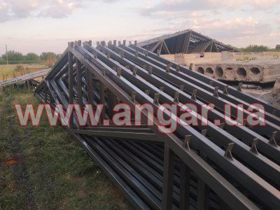 Ангар прямостінного типу. Лежалий каркас. Колони вироблені з труби перерізом 159мм. Стінка 5мм. Крок колон 4м. Всього 24шт. Висота колони 6м. Кріплення до фундаментів зварне на закладних. Ферми двоскатні цільнозварні виготовлені з труби 80х60х3мм. Крок ферм 4м. Кріплення до колон зварне. Всього 12 ферм. Конструкція складована та готова до відвантаження