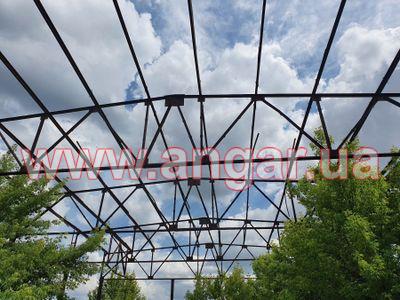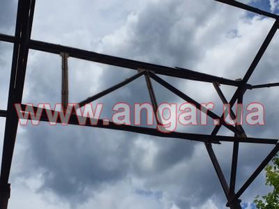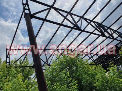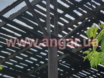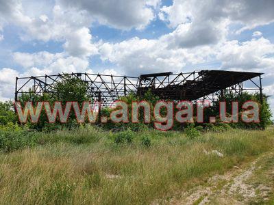 | Ангар прямостінного типу. Встановлений каркас. Двопрольотний. Колони центрального ряду з труби перерізом 300мм. Товщина стінки 7мм. Всього 7 колон. Колони бокового ряду, та торцеві колони з труби перерізом 273мм, стінка 6-7мм. Всього 14 бокових колон, та 8 торцевих колон. Висота колон 7м. Кріплення до фундаментів на анкерах. Ферми двоскатні цільнозварні. Верхній пояс зі спареного кутника перерізом 90мм, нижній пояс та розкоси з кутника перерізом 75мм. Висота ферми в коньку 2,50, по краю 1,75м. Всього 14 ферм. Кріплення до колон зварне. Покрівельні прогони з гнутого швелеру перерізом 160мм. Всього 20 рядів (720 м.п.) |