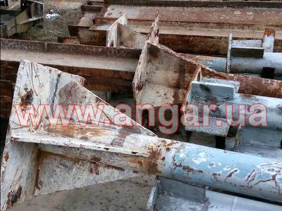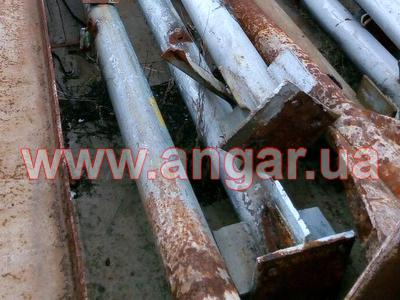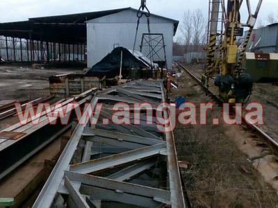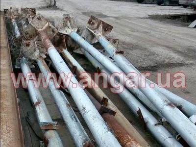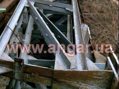 Ангар прямостенного типа. Демонтированный каркас. Колонны из трубы сечением 159мм (толщина стенки 6мм). Крепление к фундаментам на анкерах. Опорная пластина размером 600*600мм. Всего 13 колонн (12 несущих и 1 торцевая). Фермы из спаренного равнополочного уголка сечением 75*7мм. Всего 6 ферм. Крепление ферм к колоннам на болтовом соединении.