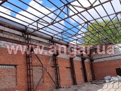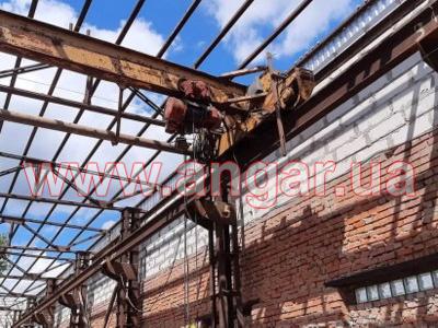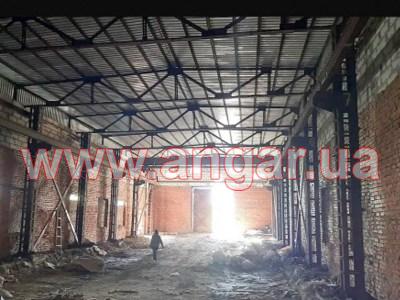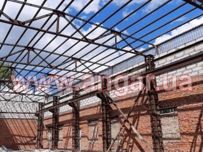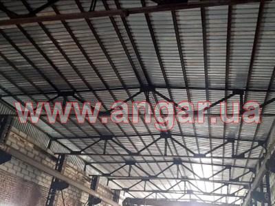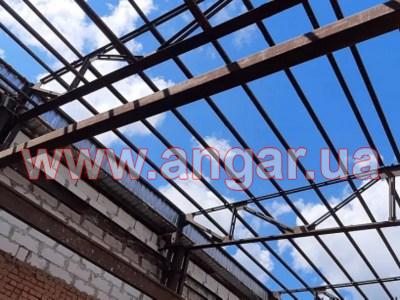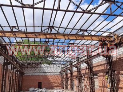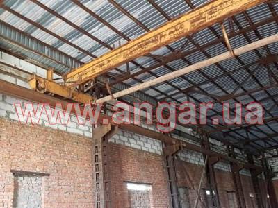| Ангар прямостенного типа. Установленный каркас. Колонна сложного сечения из 4-х неравнополочных уголков сечением 100х65мм, расшита между собой уголком сечением 35мм. Всего 16 колонн. Шаг колонн 5м. Высота колонны 7,5м. Крепление к фундаментам сварное. Ферма двускатная, верхний, нижний пояс и раскосы из спаренного уголка сечением 63мм. Крепление ферм к колоннам сварное. Всего 8 ферм. Шаг ферм 5м. На высоте 5,5м установлены консоли под кран -балку. Подкрановый путь из двутавровой балки сечением 260мм. Кран - балка грузоподъёмностью 3,2т, крюковая подвеска тельфера грузоподъёмностью 2т. По фасаду по верху идут связи из двутавровой балки сечением 120мм. Всего 70 м.п. Кровельные прогоны из швеллера сечением 65мм. Всего 630 м.п. (18 рядов). Вес конструкции около 22т. |